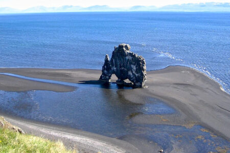 En longeant la péninsule de Vatnsnes, on découvre l’extraordinaire formation rocheuse de Hvitserkur, une falaise de 15 mètres de haut qui se dre… Lire la suite