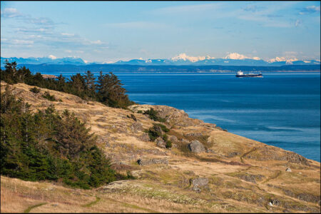 Iceberg Point sur l’île de Lopez, qui fait partie du San Juan Islands National Monument, Washington. Vue sur le détroit de Rosario et la mer des… Lire la suite