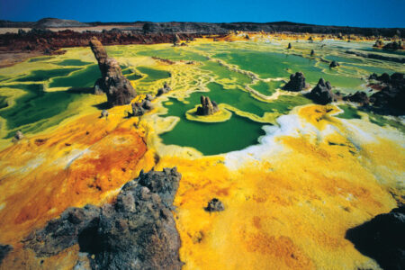 Le Dallol est un volcan en cône de cendres situé dans la dépression du Danakil, au nord-est de la chaîne de l’Erta Ale en Éthiopie. Il a été for… Lire la suite