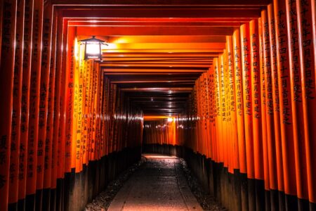 Фусими Инари-Тайша-важный синтоистский храм в Южном Киото. Он знаменит своими тысячами алых ворот тории, которые тянутся по сети тропинок позади его г… Прочитать остальное