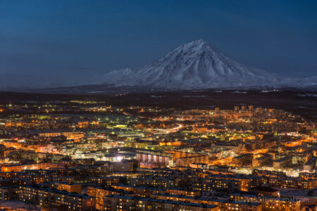 彼得罗巴甫洛夫斯克-堪察斯基–该市位于高高的山丘上,被火山包围。周围的地形多山,从城里的任何地方都无法清楚地看到地平线。