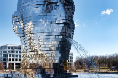 Metalmorphosis是捷克雕塑家大卫的镜像喷泉?erný这是在北卡罗来纳州夏洛特的白厅科技园建造的。 这座14吨重的雕塑由大量的不锈钢层制成,旋转360度,偶尔对齐以创建一个巨大的头部。