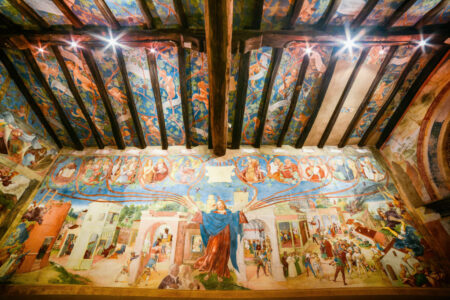 这幅壁画由Giacomo Borlone De Buschis于1484年至1485年间制作,与中世纪晚期以来在阿尔卑斯山和法德地区流行的死亡胜利(或可怕的舞蹈)的肖像静脉相吻合。 这些表示作为纪念森,即视觉提醒,旨在提醒每个人生命的短暂和死亡到来之前不可避免的失败。 肖像画非常简单,正是因为信息… 閱讀其餘內容