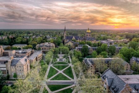 主行政大楼顶部的金色圆顶已成为圣母大学最知名的标志之一。 在火灾后重建,圆顶顶部有一座19英尺镀金的圣母玛利亚雕像,以反映大学的天主教身份。 其他建筑地标包括圣心大教堂,它拥有世界上最大的19世纪法国彩色玻璃收藏。