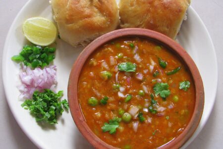 Pao bhaji是孟买的一道招牌菜,从小街开始供应,蒸熟的蔬菜泥(主要是土豆、豌豆、西红柿、洋葱和青椒),加上绿色蔬菜和大量黄油煮熟。它与面包一起吃,面包用更多的黄油烘烤,配上洋葱片。