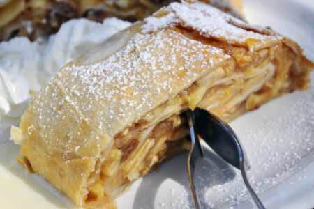 在哈布斯堡帝国的影响下,Apfelstrudel在东欧各地流行起来。 在维也纳附近的面包店,咖啡馆和餐馆出售,这是一个微妙的对位略重的美国苹果派。 它通常是用轻,酥脆的糕点面团,拉伸和变薄,充满了苹果,糖,葡萄干,柠檬,朗姆酒,肉桂和丁香。 通常情况下,馅饼配上与坚果混合的面包屑,并撒上糖粉。… 閱讀其餘內容