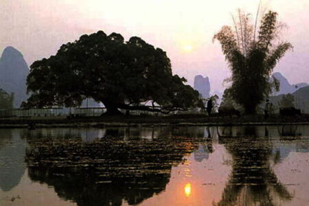 大榕树,位于阳朔镇外不到四英里(6.4公里),是一个大的,保存完好的榕树据说在中国的金朝种植。 这棵55英尺(16.8米)高的树在树枝下拍摄了中国电影刘三姐(刘三姐)的一个着名场景后获得了恶名。 在电影中,主角在树下向她的爱人扔了一个丝绸球,以表达她的爱。